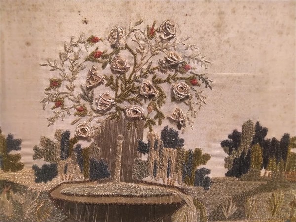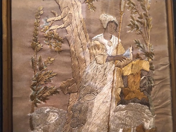 Entrelacs de techniques : peinture, dessin, couture.., ces tableaux d’une minutie extrême, témoignent des travaux d’aiguille réservés aux jeune filles et aux pensionnaires des institutions religieuses.
