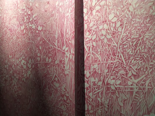 Dans l’un des deux sas, les évolutions déliées d’un lapin danseur côtoient la végétation du Jardin del amor, tenture crayonnée digne des illustres tapisseries du moyen-âge.
