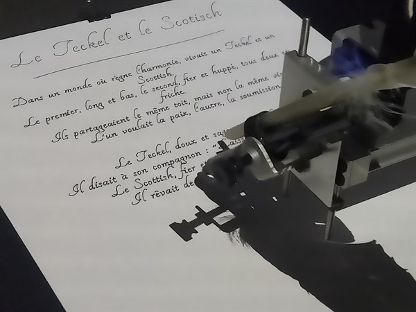 La Fabrique des fables trouve une illustration littérale dans les Fabulations de La Fontaine où, dans une calligraphie impeccable, une plume rédige des fabliaux inédits, issues des algorithmes d'une Intelligence Artificielle, préparée par Filipe Vilas-Boas.