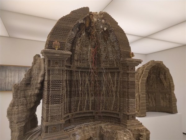 L’esprit d'escalier dialogue avec le dédale du bâtiment. Le labyrinthe est récurrent, constitué par des cannes de marche ou une procession de drapeaux nationaux, qui dessine un itinéraire inextricable, à travers frontières et continents.